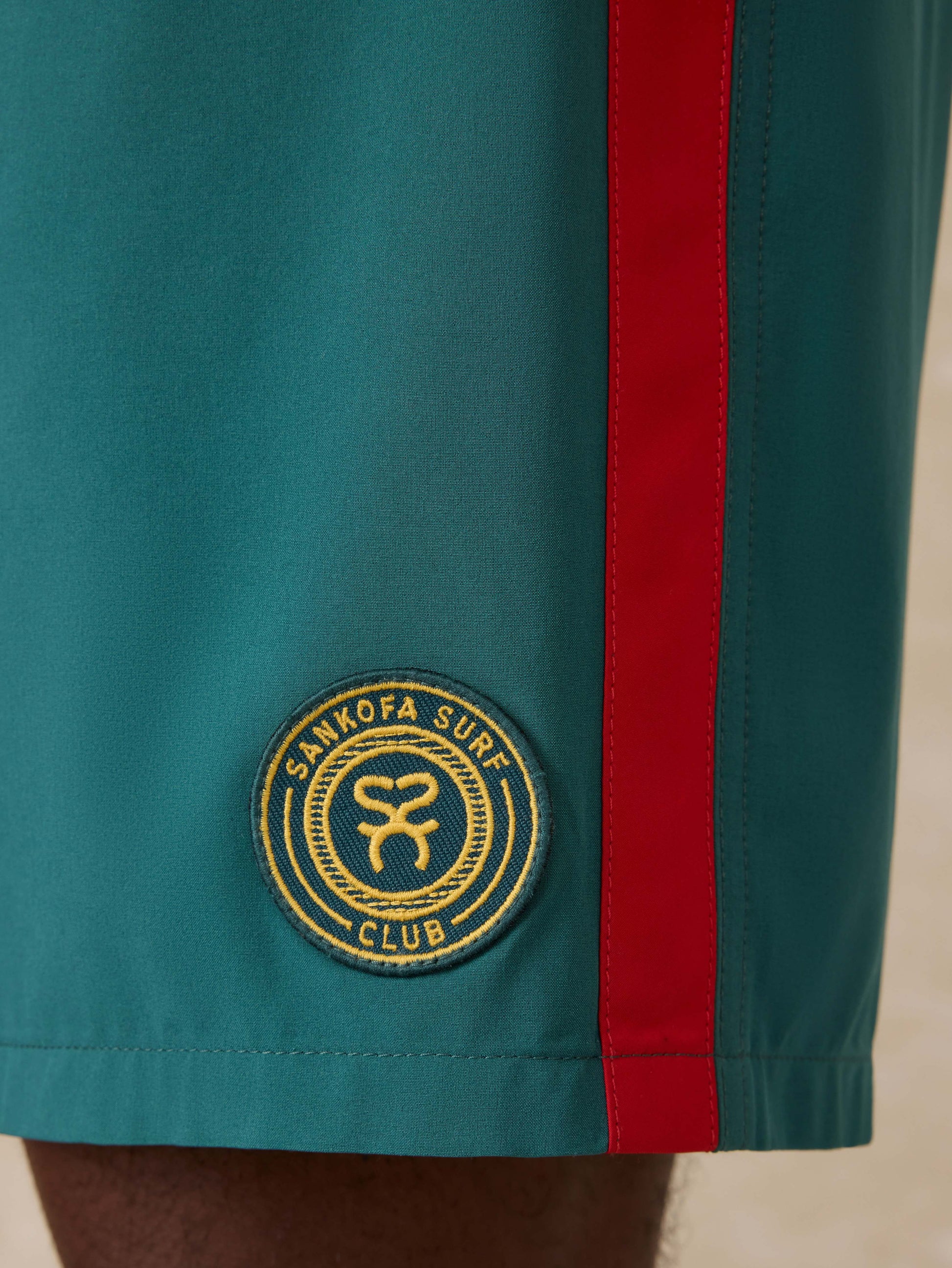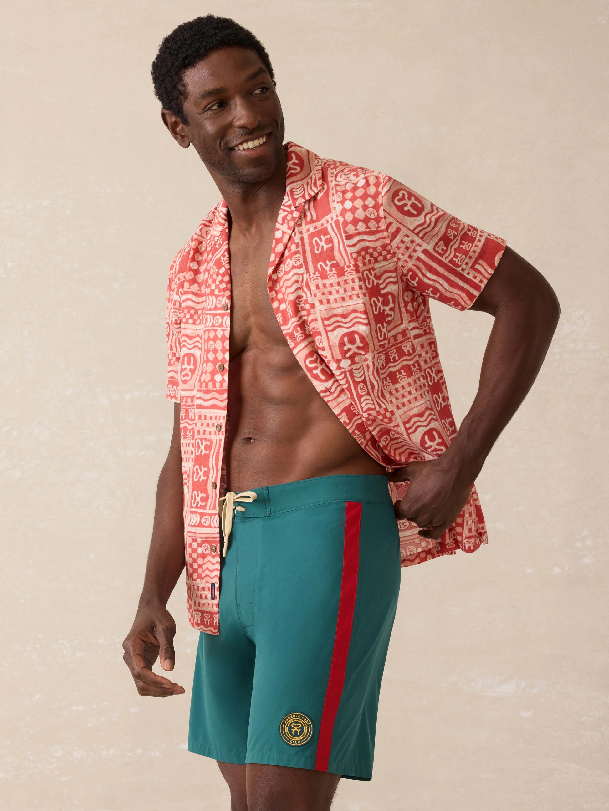 Crafted from quick-drying, sustainable fabric with just the right amount of stretch, these boardshorts are built for all-day surf sessions and laid-back beach hangs. Featuring artwork that reps Surf Ghana—a dynamic surf and skate collective from the coastal village of Busua—they bring bold energy and purpose to every wave.Detail: Top applied stripes at outseams. Reverse entry zipper pocket at wearer's right backside. Classic boardshort drawcord tie closure. Gusset fly with both velcro closure. Compression knit liner with media pocket on wearer's left side. "Sankofa Surf Club" woven patch at wearer's left hem. Faherty Brand woven label at center back of waistband.Material: 86% Polyester Recycled 14% SpandexModel: Jamal is 6’2 wearing size MediumCare: Close all zippers before wash. Turn inside out. Machine wash cold with like colors. Delicate cycle. Do not bleach. Tumble dry low. Remove promptly. Warm iron if needed.MSS2508-AGG