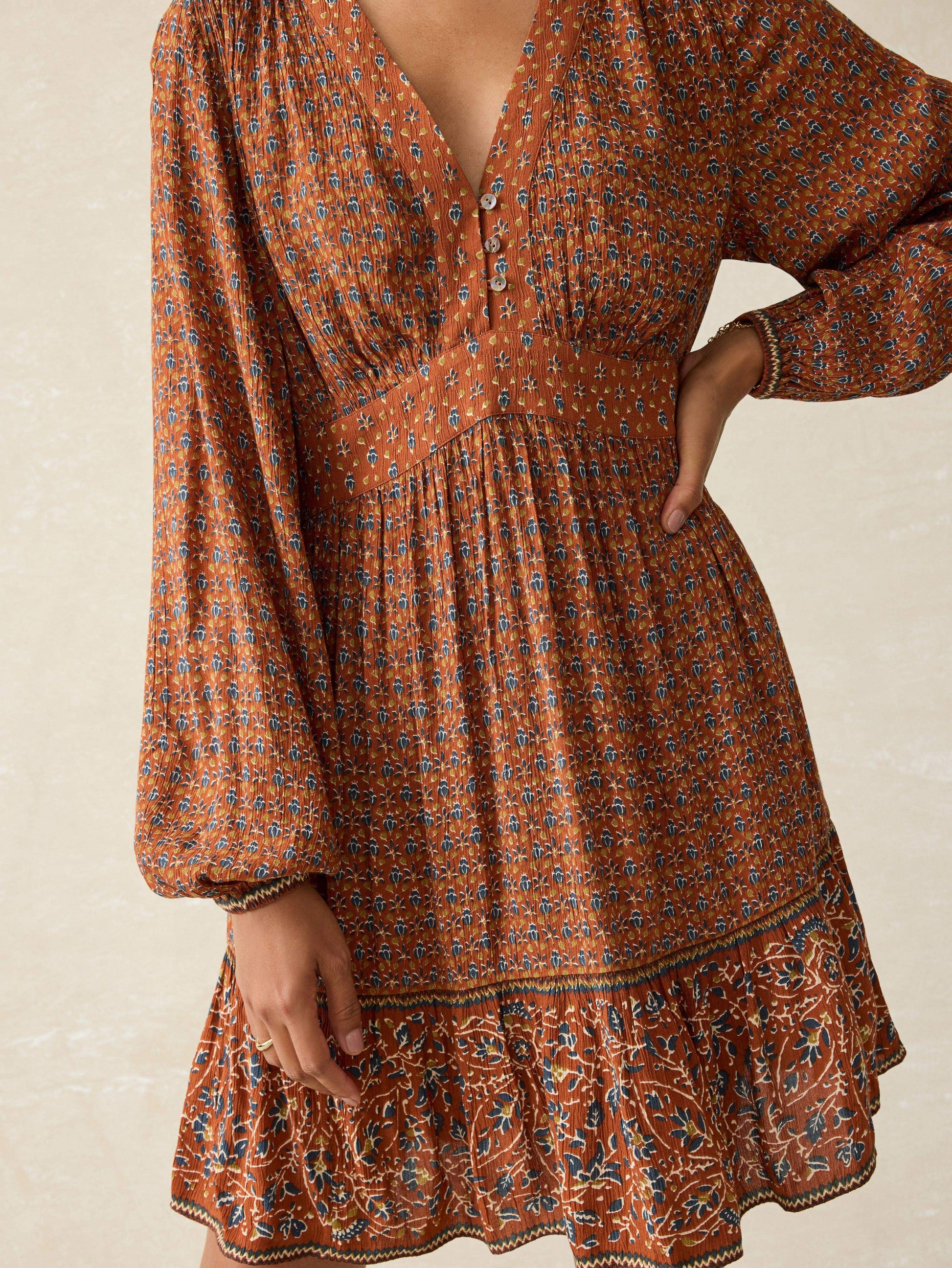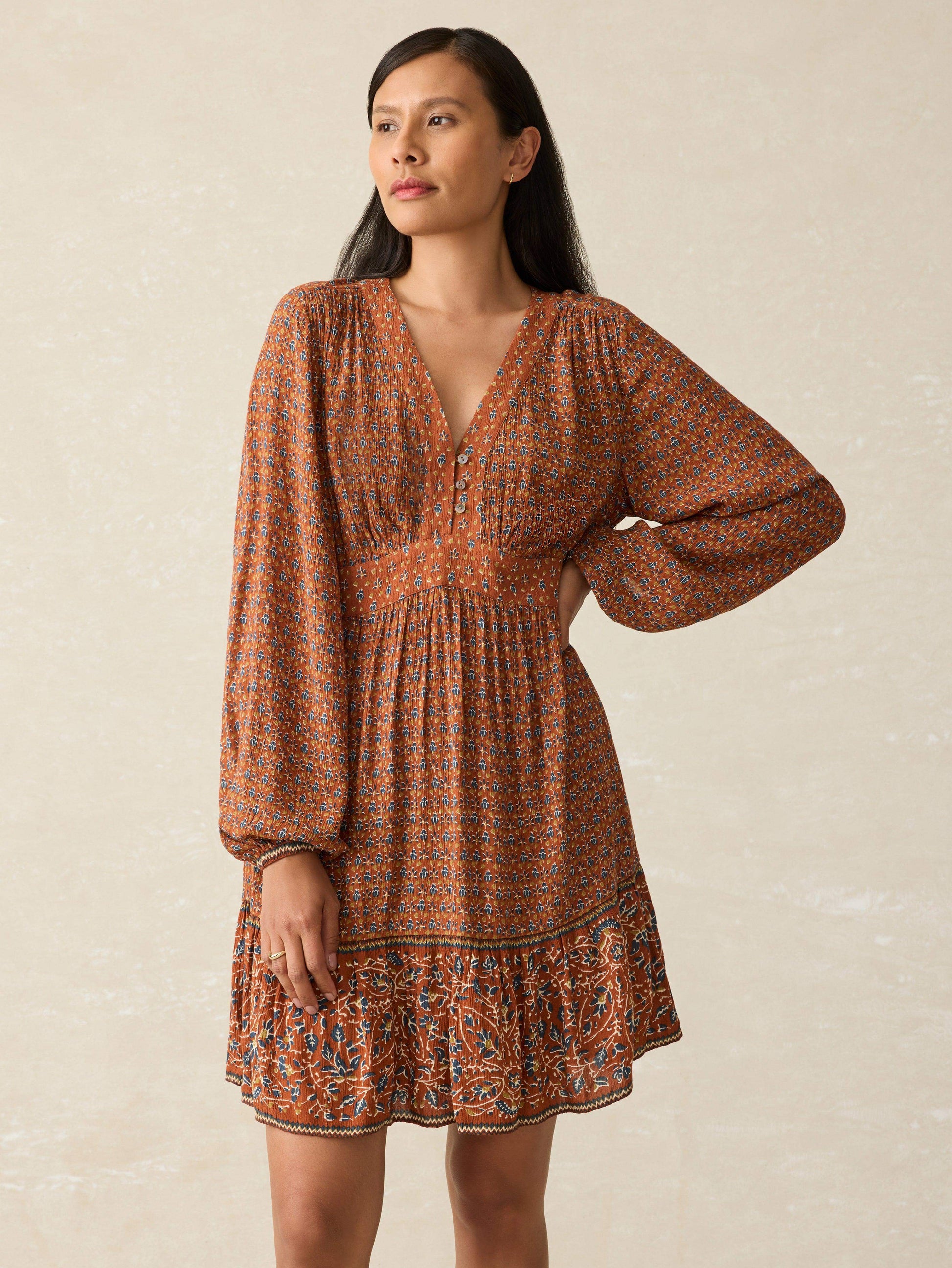 Blending sophistication with an easy, wanderlust mood, this the perfect in-between seasons dress to wear now with sandals and later with a chunky cardigan and boots. Smocking at the back waistband and a flowy, shirred skirt make it a breeze to wear all day, but it's the mixed artisan prints inspired by vintage textiles that make it a standout.Fit: Long sleeve, Relaxed fit. Detail: Functional half placket with mussel shell buttons. Smocking panel at natural waist.Material: 100% LENZING™ ECOVERO™ Viscose, Mussel Shell ButtonsModel: Christabel is 5'10.5 wearing size Small Care: Close all fastening before wash. Turn inside out. Machine wash cold with like colorsWDF2402-UBL